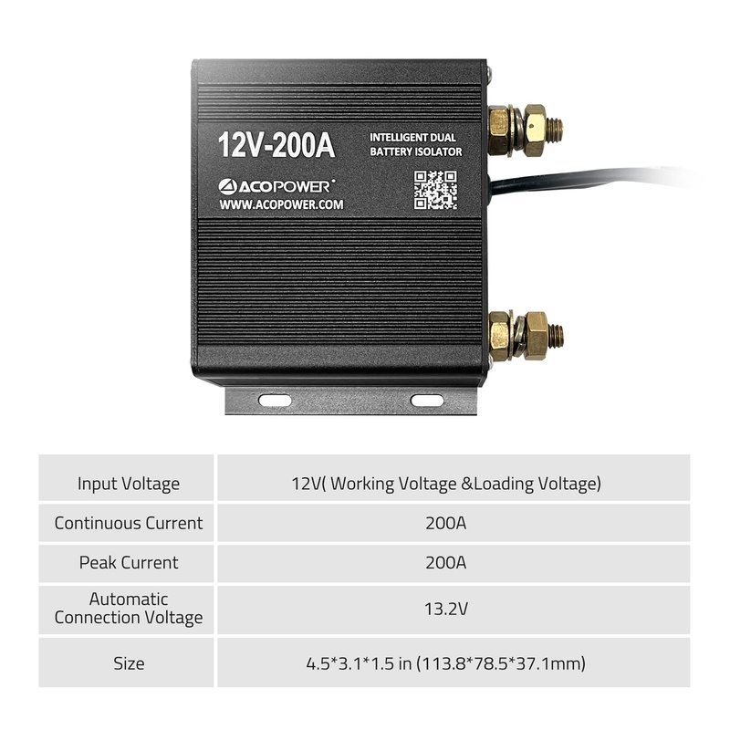 - 🌞【Function】12V/200A Dual Battery Smart Isolator is a primary battery saver, which used to combine two batteries when an alternator is charging (engine running) and isolate them when not charging (engine off) so you can still start your vehicle.