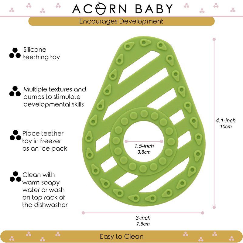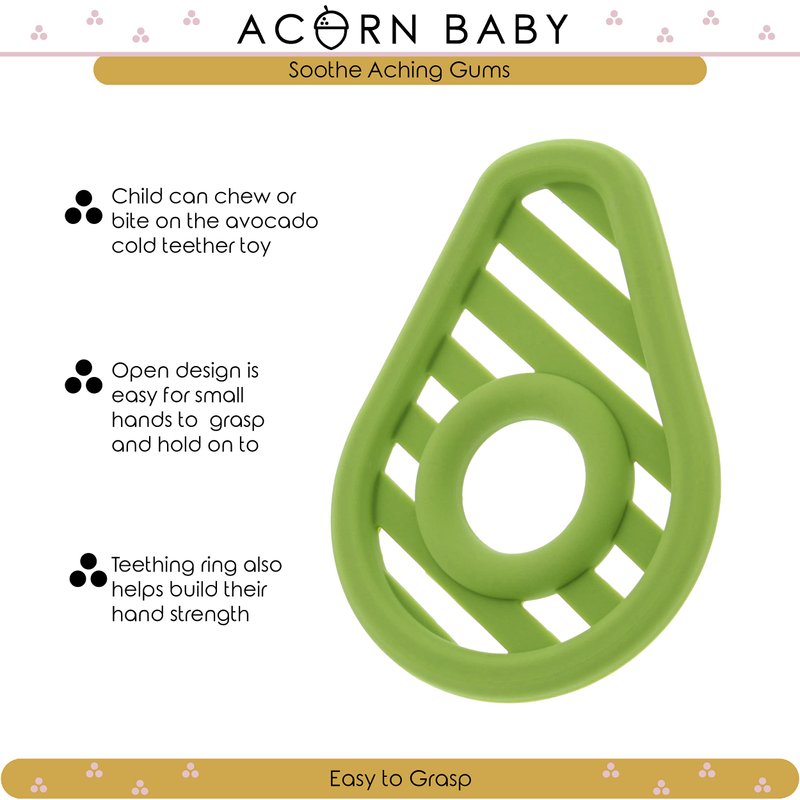 - [Soothe Aching Gums]: Soothe your little one's aching and swollen gums with the Acorn Baby Freezer Teether; Place the avocado shaped teether ring toy in the freezer as an ice pack