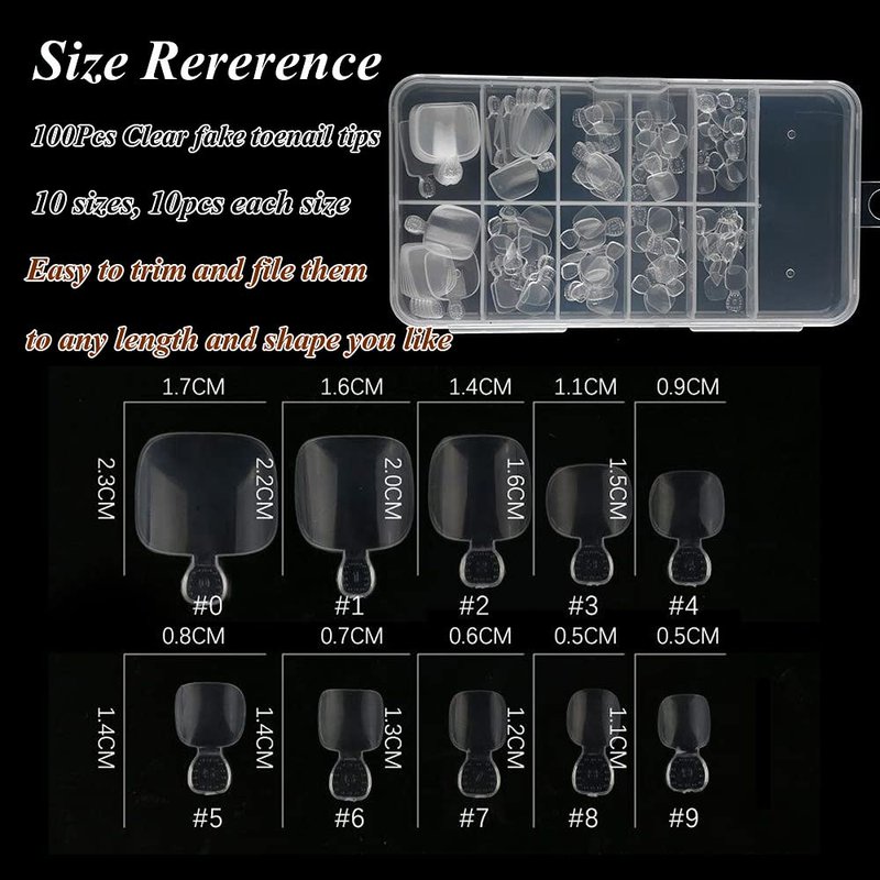 - 100PCS WITH DIFFERENT SIZE: 100Pcs Clear fake toenail tips are made into 10 sizes, 10pcs each size. Every 10 toenails are packed in a box with a number, so you can easy to mark it and keep track of. Fit for most toenails, and it’s easy to trim and file them to in any length and shape you like.