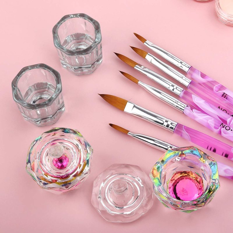 - Acrylic Nail Art Brush Dappen Dish Kit: This nail art tool set comes with 6 Acrylic DIY brushes and 4 crystal acrylic nail glass cups for acrylic gel mixing to DIY nail art.