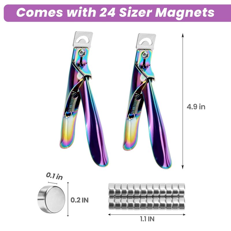 - Package & Material: Includes two acrylic nail clippers and 24 sizer magnets, the nail tips cutters made of high-quality stainless steel, and its surface is coated with colored titanium, which makes it beautiful and durable.