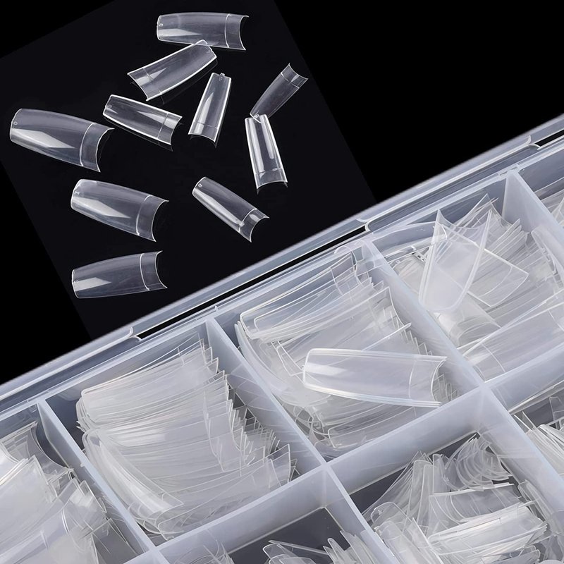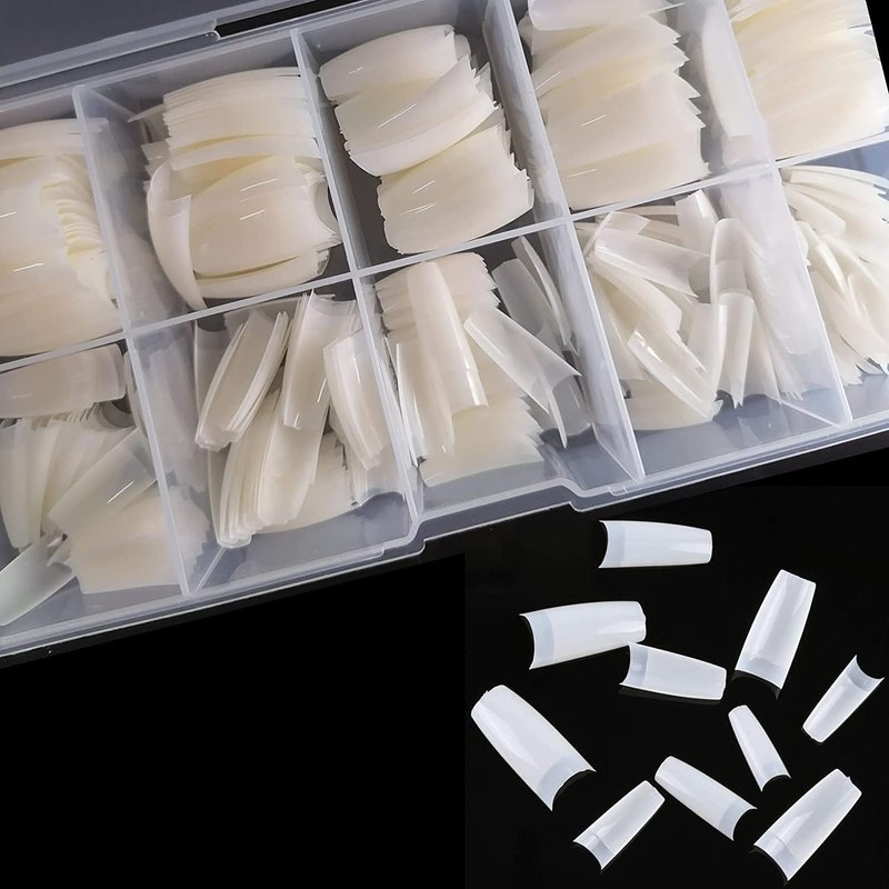 - Professional nail tips with unique design provides, which is suitable for most people! clear and natural acrylic nail tips are designed with Half Cover shape with moderate length and thickness,which is thick and sturdy enough to last about 2-3 weeks.
