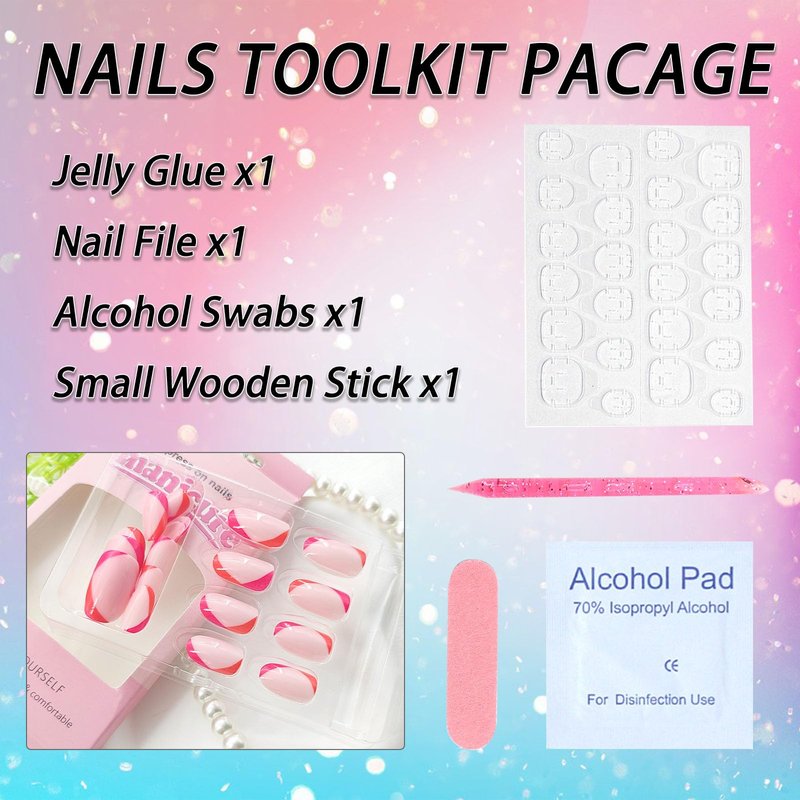 - You Will Get:The package contains 24 pieces of fake nails press ons of different sizes,1 bottle of glue,1 pack of alcohol cotton,1 mini nail file,1 small wooden stick, and 24 piece jelly glue.(jelly glue can last about 3 days or more, glue remains longer)