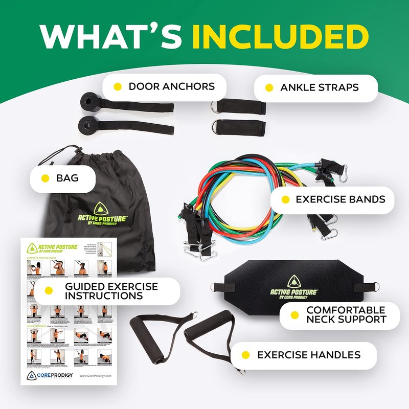 Do you experience headaches or neck and back pain? A common reason is poor posture. The day to day activities of simply using gadgets or electronic such as cellphones, tablets, laptops and computers whether at home or in the office can cause improper body alignment. Instead of a passive posture brace. build muscle through targeted exercise with a back posture corrector that'll leave you feeling stronger and better. The Core Prodigy Active Posture Corrector for women and men supports this kind of targeted muscle training and is the neck and upper back posture corrector you've been looking for. Restore Spinal Posture - This package includes head harness, 5 resistance bands, exercise poster, 2 door anchors, 2 handles and ankle straps.