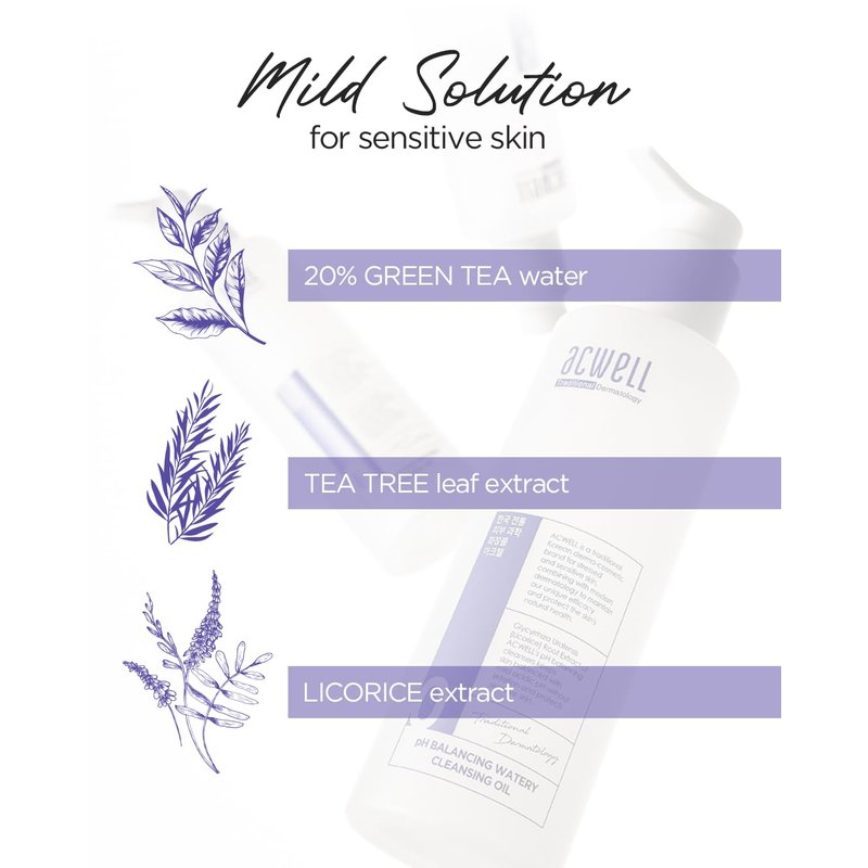 - HYDRATING AND NOURISHING INGREDIENTS: Acwell oil-based cleanser contains green tea water and tea tree leaf extracts. This blend of hydrating ingredients helps soothe irritated and sensitive skin while deep cleansing the impurities from the pores.