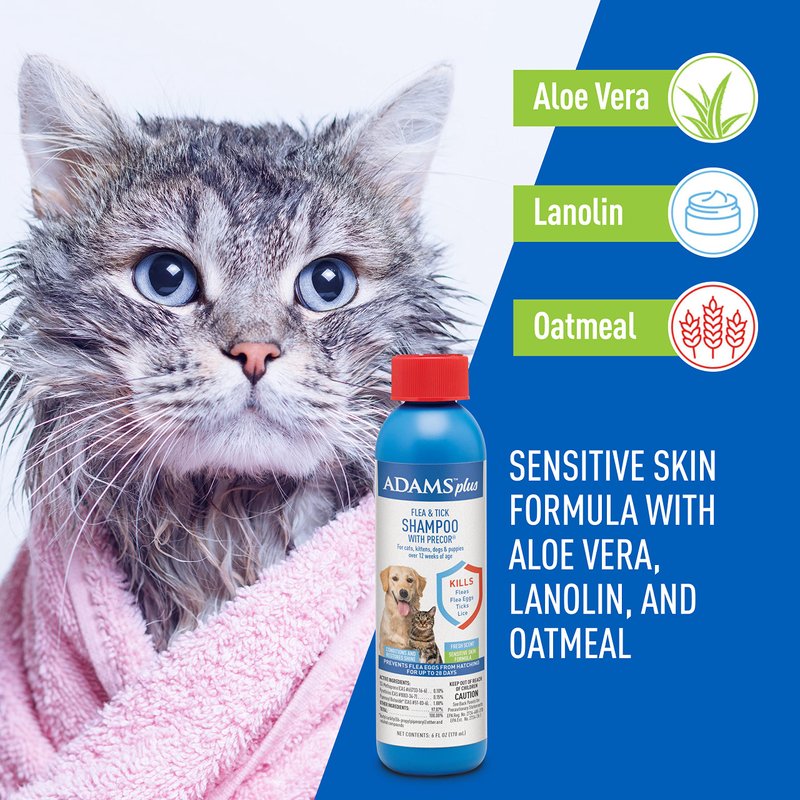 Adams Plus Flea & Tick Shampoo with Precor for Cats, Kittens, Dogs & Puppies Over 12 Weeks Of Age |Sensitive Skin Flea Treatment for Dogs & Cats |Kills Adult Fleas, Flea Eggs, Ticks, and Lice |6 Oz