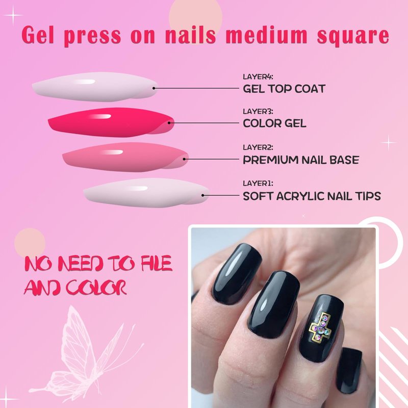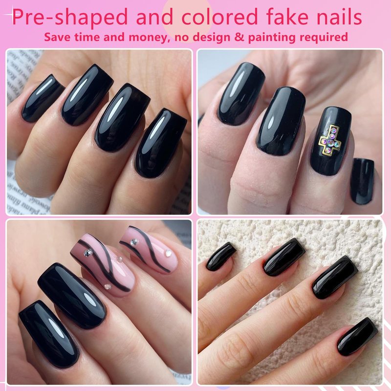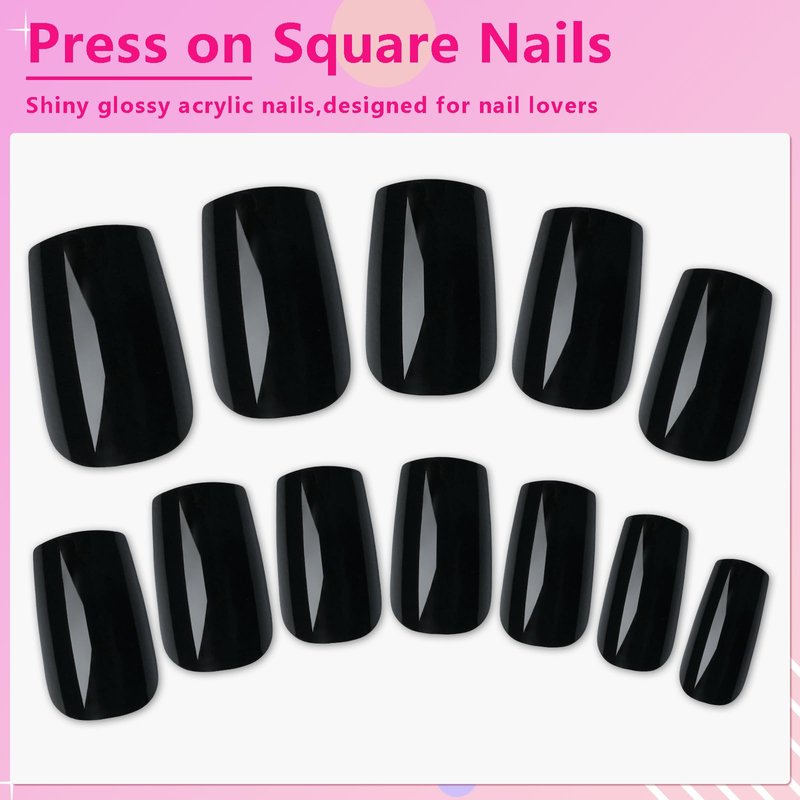 - Faster and Easier to Use: The black square press on nails set comes with glue adhesive tabs. Simply clean your nails, stick the nails on with adhesive tabs, and you're done! No filing, polishing, or drying is needed. Create beautiful, pre-shaped medium nail enhancements in just 10 minutes or less, saving you time and money