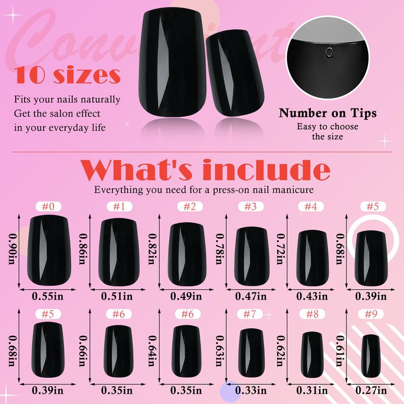 - Convenient Square Press on Medium Nails: The black square press ons nails are packaged in a clear plastic case and meet all your different needs, whether you want at-home nail care, DIY nail extensions, or to save money on salon visits. They are also convenient for travel and perfect for any occasion.