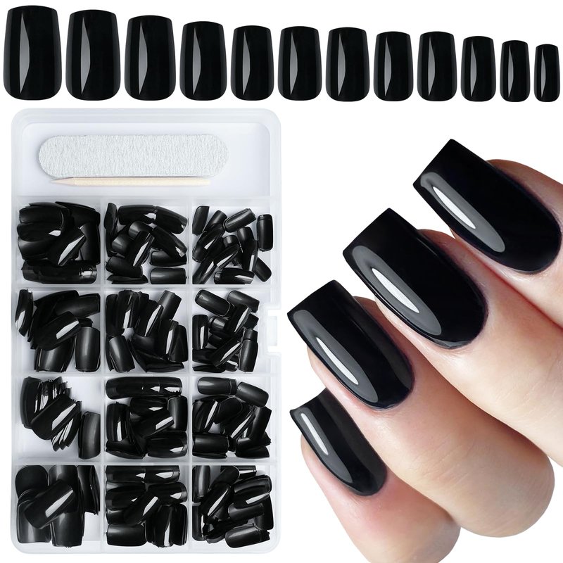 - Square Press-on Nails Medium Length Kit: This kit includes 240pcs glossy gel black press on nails in a medium square shape, 5 sheets of nail adhesive tabs, 1 mini file, and 1 wooden stick. The medium press on square nails kit provides everything you need for a press on nail manicure, making it easy to achieve a salon effect at home. The odorless medium press on nails will not harm or damage your natural nails or body