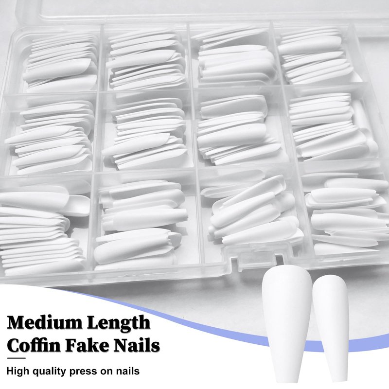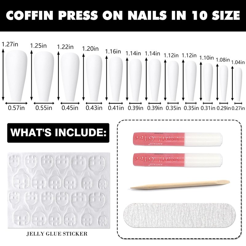 - Long Press on nails: content 240pc/pack of white coffin nails in 10 size, and comes complete with a clear storage box, 2*2g nail glue, 3 sheet sticky tabs, nail file, cuticle stick, we give you everything need for press ons! this nail kit is great gift for women and girls