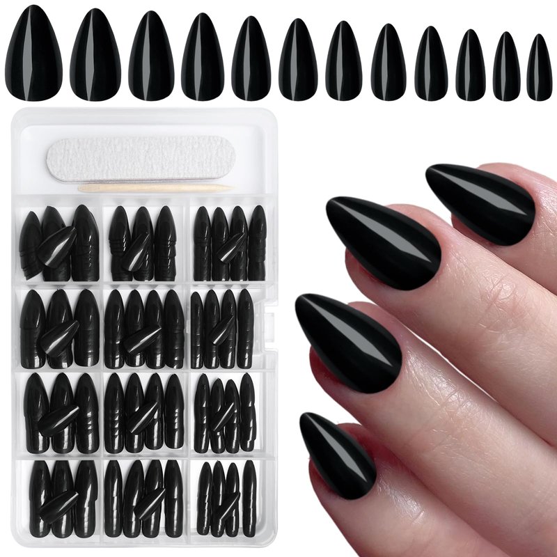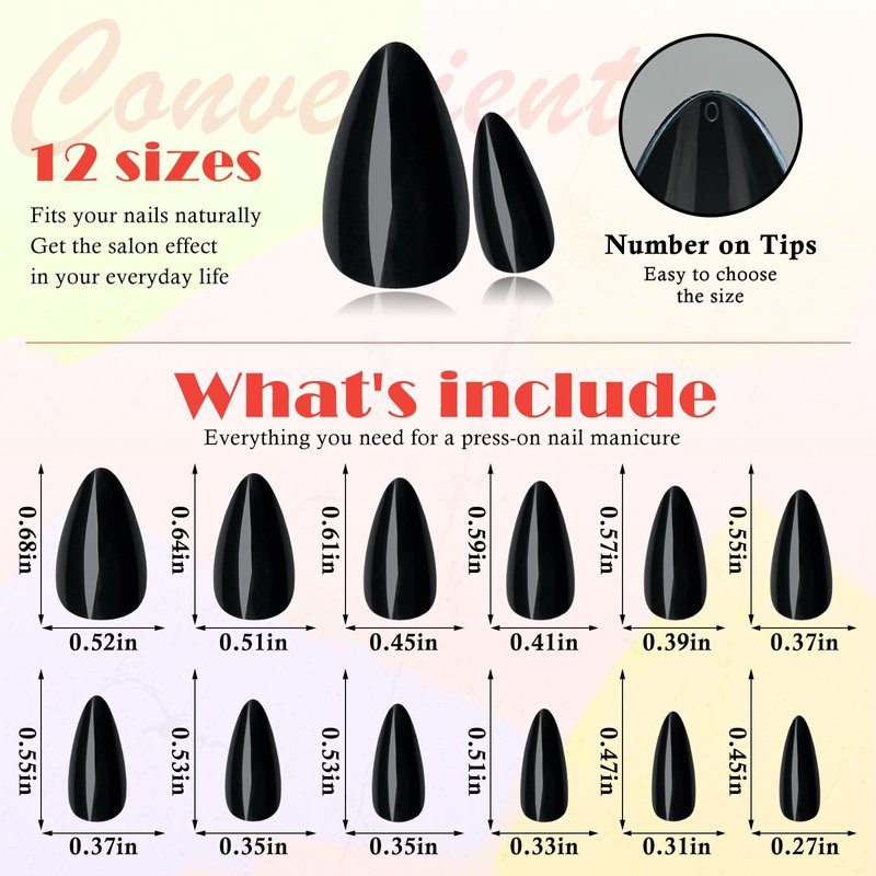 - Press on nails short almond kit: included 360pc solid colored glossy black press on nails almond shape, 5 sheets adhesive glue sticky tabs, 1pc 100/180 grit nail file tools and 1pc wooden stick, come with everything you need for a quickly DIY nail art manicure