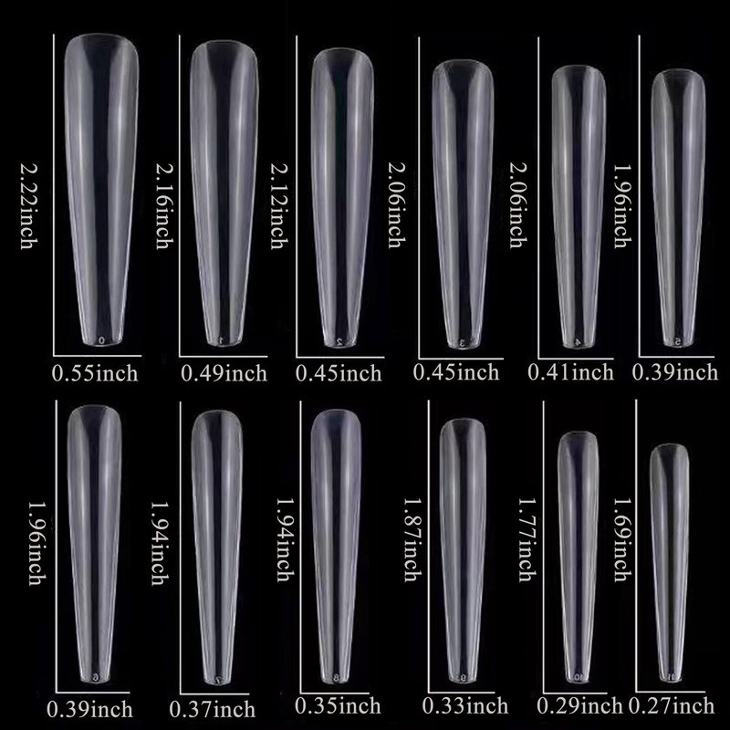 - Various size for choose, acrylic fake nail tips have 12 different sizes with 50 nails of each size numbered 0-11 individually in bags, so they're convenient to choose the most suitable size that fits your every finger whatever you have large nail bed or narrow finger. Size 0 length is 5.6cm