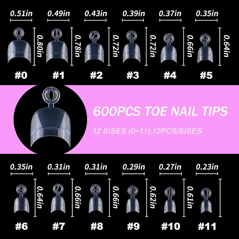 - Variety of Sizes for a Perfect Fit: The set includes 600 pieces of gel x toe nail tips in 12 different sizes (50 pieces each), numbered from "0-11." They come neatly organized in a clear box with 12 grids, making it easy to find the perfect fit for every toenail