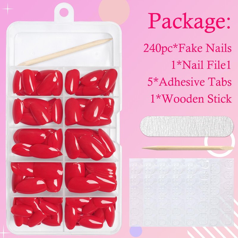 - Oval press on nails short kit: You will get 240pcs of short oval red press on nails in 12 sizes, 5 sheets of adhesive tabs, 1 mini file, and 1 wooden stick. This is a great value press on nails pack for home nail art manicures. It contains everything you need for a press-on nail manicure, saving you money and time to achieve a salon effect at home