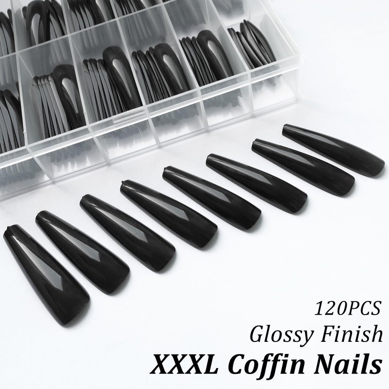 AddFavor XXXL Extra Long Press on Nails Coffin Glossy Black Fake Nails Full Cover Acrylic False Nails 12 Sizes 120pcs Nail Tips for Women Fingernails Manicure Design