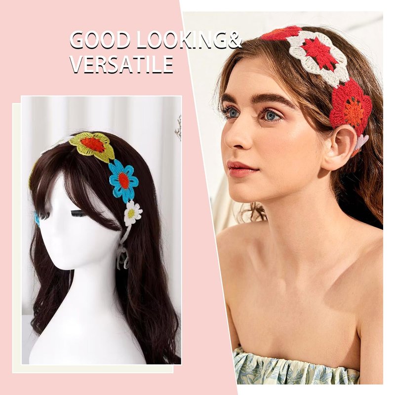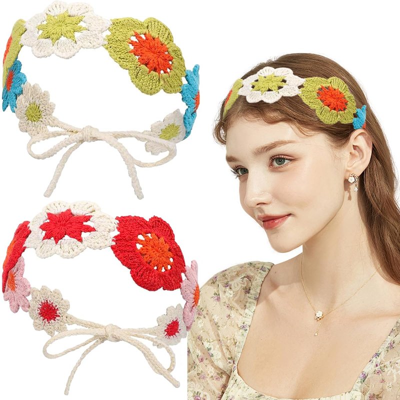 AddLotLot 2 PCS Crochet Headbands Hippie Headbands Crochet Hair Bandanas Boho Headbands Knit Headband Floral Boho Lace Hollow Hairband Bandana Tie-Back Knit Headband Vintage Bandana for Women Girls