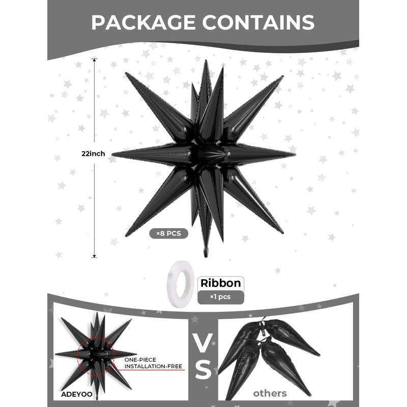Adeyoo 8Pcs Star Balloons, Explosion Starburst Balloons One-Piece 14 Point Black Foil Balloons 22 Inch 4D Spike Mylar Balloons for New Year Wedding Anniversary Backdrop Birthday Party Decorations
