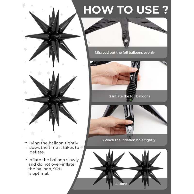 - Easy to Assemble: Black star balloons can seal themselves and do not need to be tied. Unlike other star balloons, our explosion star balloons are one-piece and so you don't have to assemble them. Just press the self sealing tail.In just one minute, the star burst balloon is completed! It's that simple.
