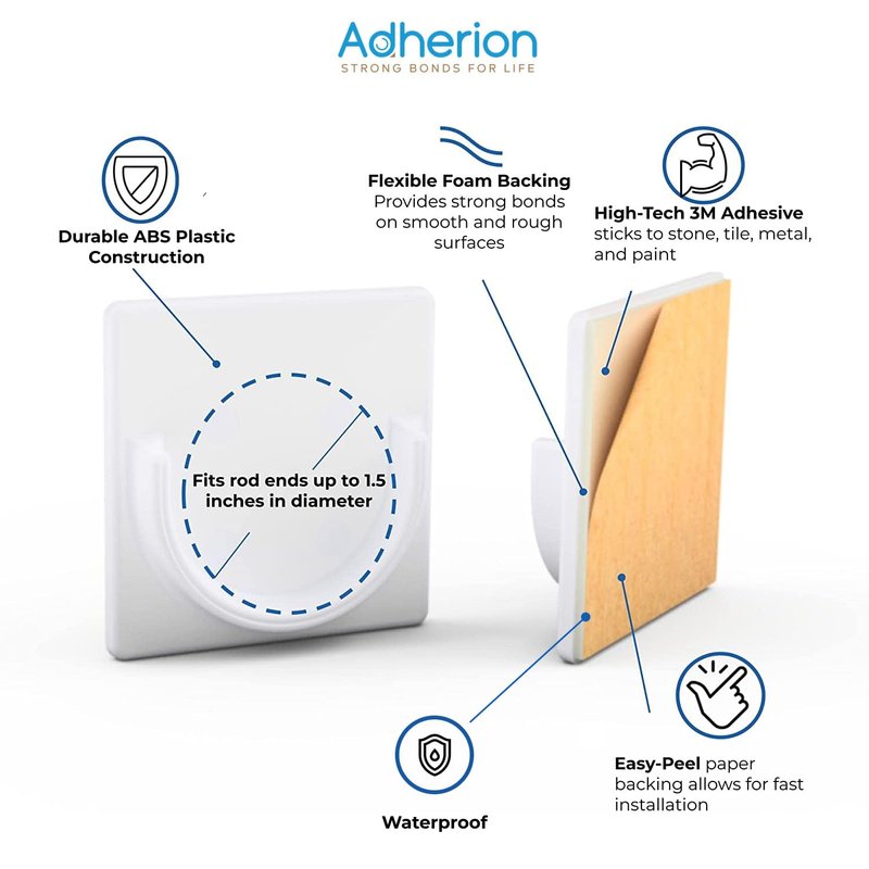 - Never Worry About Falling Shower Rods Again - Say goodbye to falling shower rods with Adherion's adhesive curtain rod holder. Our high-tech 3M adhesive ensures your tension rod stays right where it’s supposed to, so you can enjoy a relaxing shower without interruptions