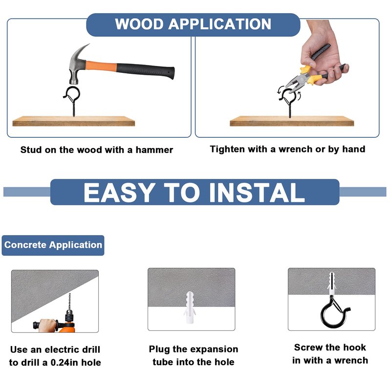 - Easy to Install & Use: String light hooks are easy to install. You can screw the hooks into the wood by hand or with a wrench, or use an electric drill to drill a 0.24in hole in the concrete wall, plug the expansion tube into it, finally use a wrench to screw the hook in. Great for patio, roof, deck, ceiling, porch, balcony, tree, fence, and more.