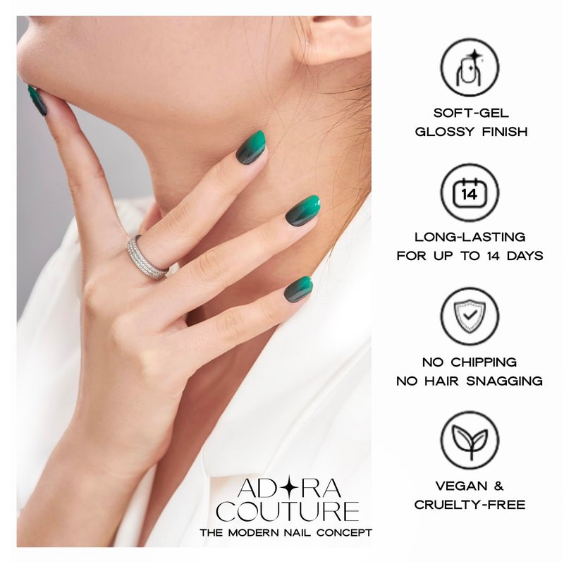 𝐀𝐃𝐎𝐑𝐀 𝐂𝐎𝐔𝐓𝐔𝐑𝐄 salon-quality nail strips are brighter, thicker, and tougher, consisting of a topcoat, color coat, base coat, and non-toxic adhesive layer. With our easy-to-apply and long-lasting strips, you'll not only impress your family and friends, but you'll also have the opportunity to save time and money in the process.