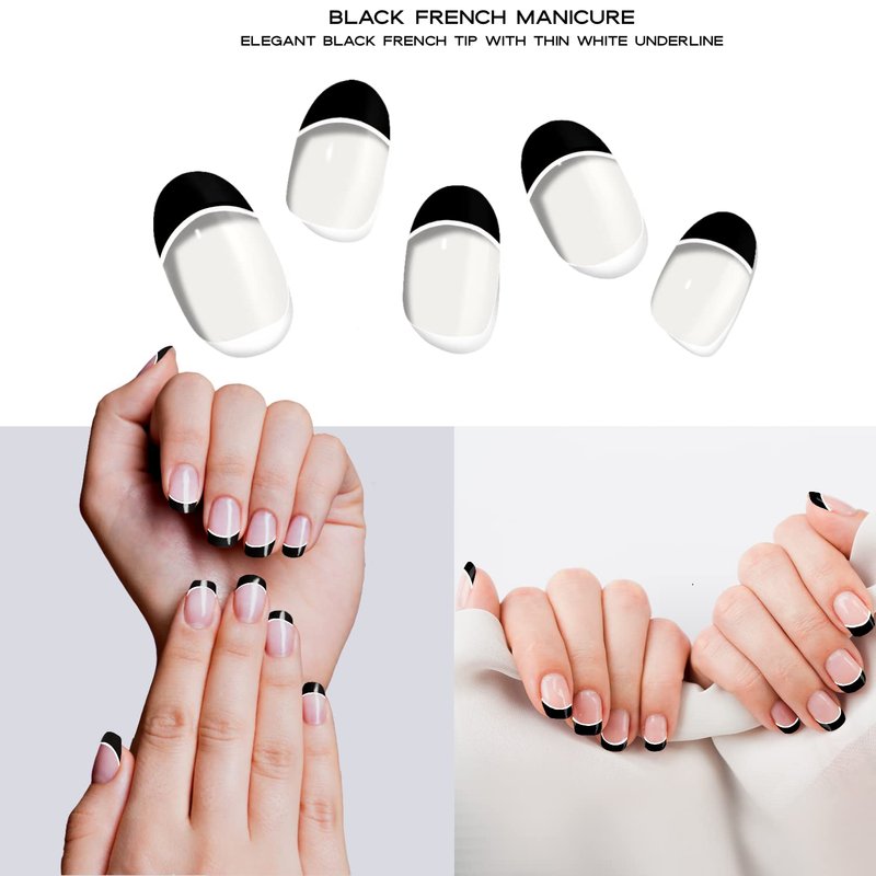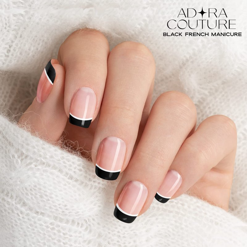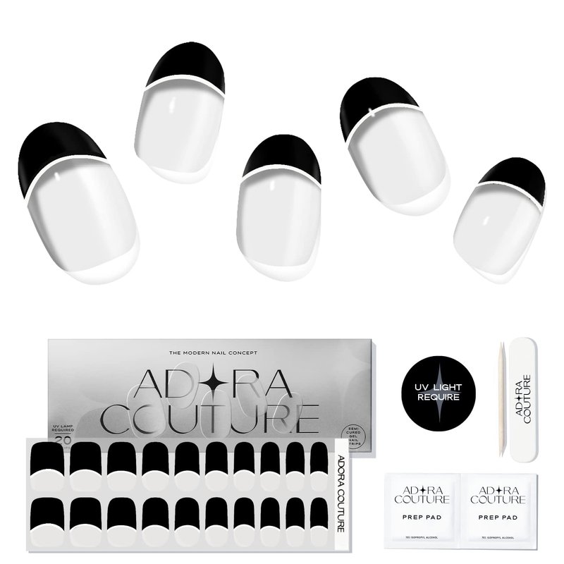Adora Couture Semi Cured Gel Nail Strips French Tip |20pcs Black French Tip Nails Clear Base French Manicure Strips Nail Wrap Gel Nail Sticker | Gel Nail Stickers with UV Light French Tip (Gotham)