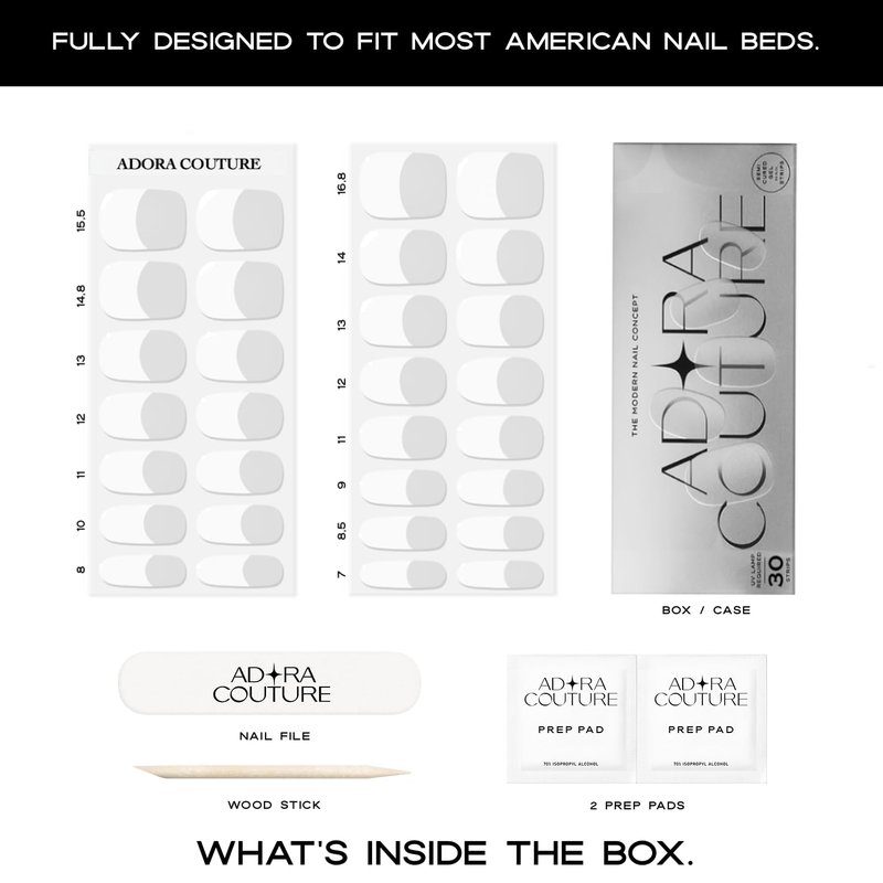 - ✦ 𝐈𝐍𝐍𝐎𝐕𝐀𝐓𝐈𝐕𝐄 𝐆𝐄𝐋 𝐍𝐀𝐈𝐋𝐒 𝐒𝐓𝐑𝐈𝐏𝐒: Made with 100% Real Gel. Through professional technology, Adora Couture presents products made with an innovative formula to achieve the perfect aesthetic for your nails. Adora Couture provides you with an easy solution to have beautiful true gel nails strips you can do at home.