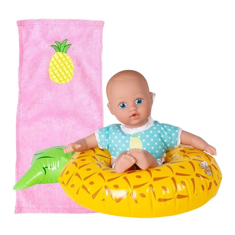 - 3-PIECE SET - This Adora baby doll set comes with one 8.5-inch baby doll with an attached pineapple-printed swimsuit, a Sweet Pineapple doll floatie, and a pool towel.