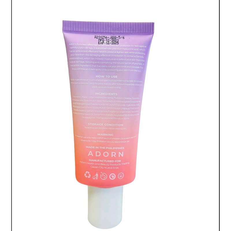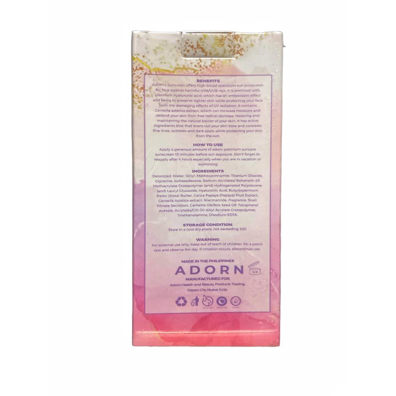 HOW TO USE: Apply a generous amount of adorn premium sun care sunscreen 15 minutes before sun exposure. Don't forget to reapply after 4 hours especially when you are in vacation or swimming.