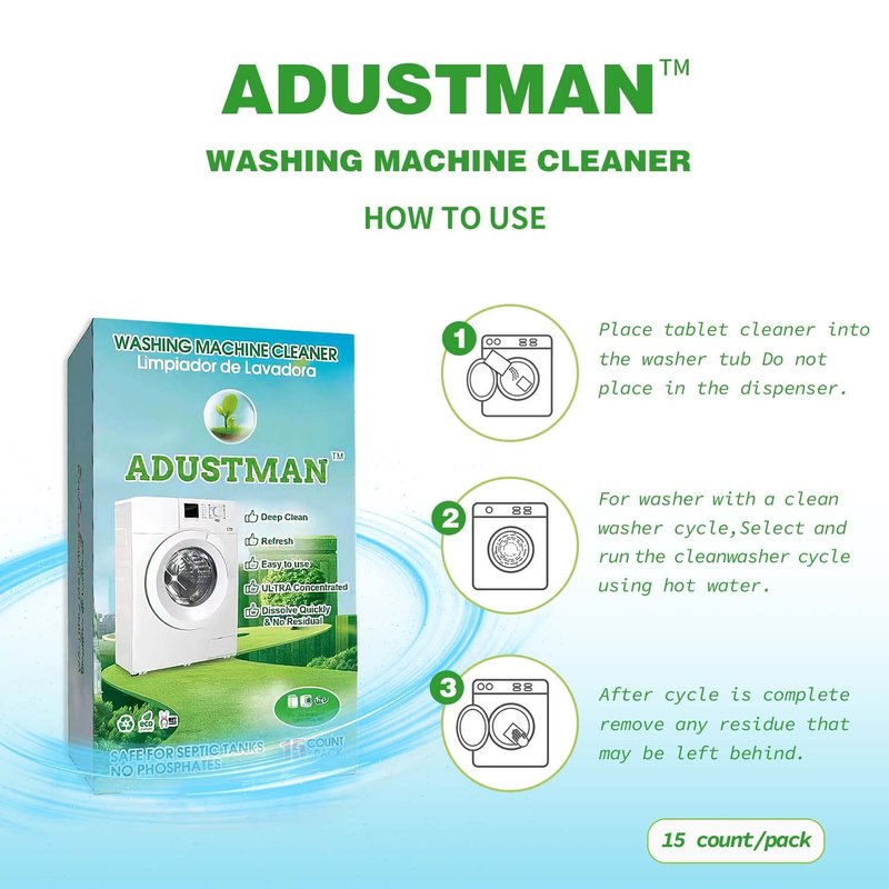 3 STEPs: handle with dry hands 1.Place cleaner into automatic washer tub. 2.For washer with a clean washer cycle,select and run the clean washer cycle,using hot water. 3.After cycle is complete,remove any residue that may be left behind. NO Waste, NO Mess For all machines Work with warm or cold water tablets are designed to dissolve completely during your wash cycle.HE WASHER:SELECT AND RUN A NORMAL OR HEAVY CYCLE WITH THE HOT WATER;NO HE WASHER:SELECT LARGEST LOAD AND LONGEST CYCLE.