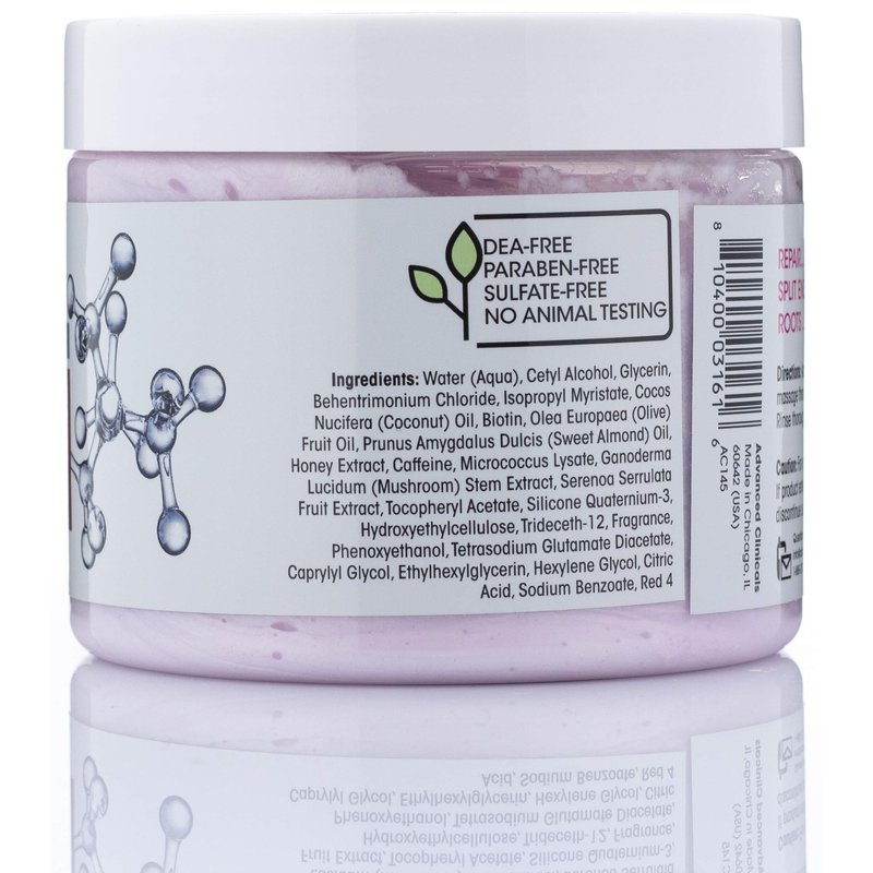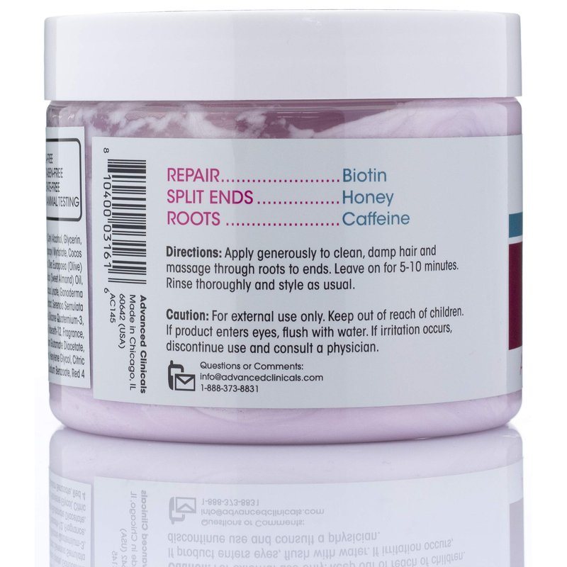 Advanced Clinicals Biotin Anti-Breakage Hair Repair supports strong, shiny locks with Manuka Honey and Sweet Almond Oil. Replenishes moisture to damaged locks with Vitamin E. Recover dry, broken strands while supporting optimal follicle and scalp health with Saw Palmetto, Mushroom and Sea Kelp extracts.