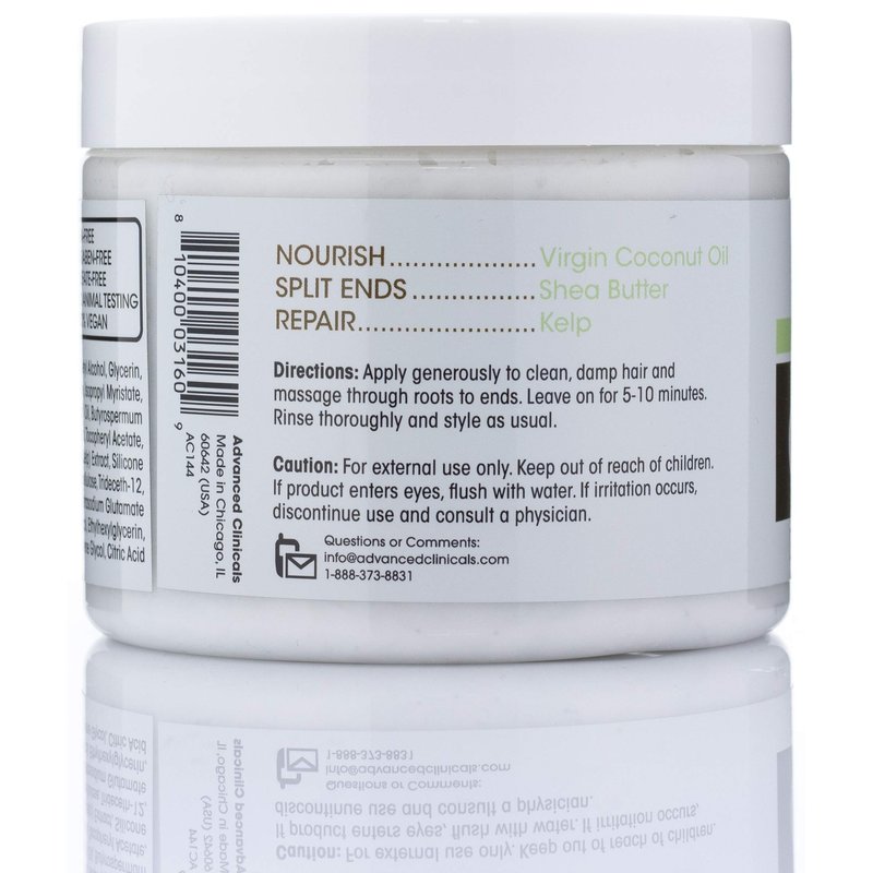 Advanced Clinicals Coconut Deep Hydration Hair Mask supports soft, shiny, locks with Vitamin E, Kelp, and Shea Butter. This deep hydration mask was designed for all hair types in need of a boost of moisture, shine and smoothing. In just 5 minutes our Coconut Oil mask repairs hair damaged by heat, styling, dyes and the environment with Vitamin B5.
