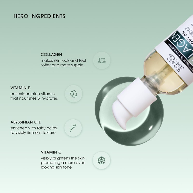 - COLLAGEN OIL – Collagen is a protein found naturally in our skin, bones, & connective tissue, and it plays a critical role in maintaining our skin's elasticity & firmness. As we age, our body's natural collagen production declines, which can lead to the appearance of fine lines, wrinkles, & sagging skin. Advanced Clinicals Collagen body oil helps boost skin elasticity, restore collagen within your skin, and hydrate + nourish your skin, leaving it feeling more soft, supple, & radiant.
