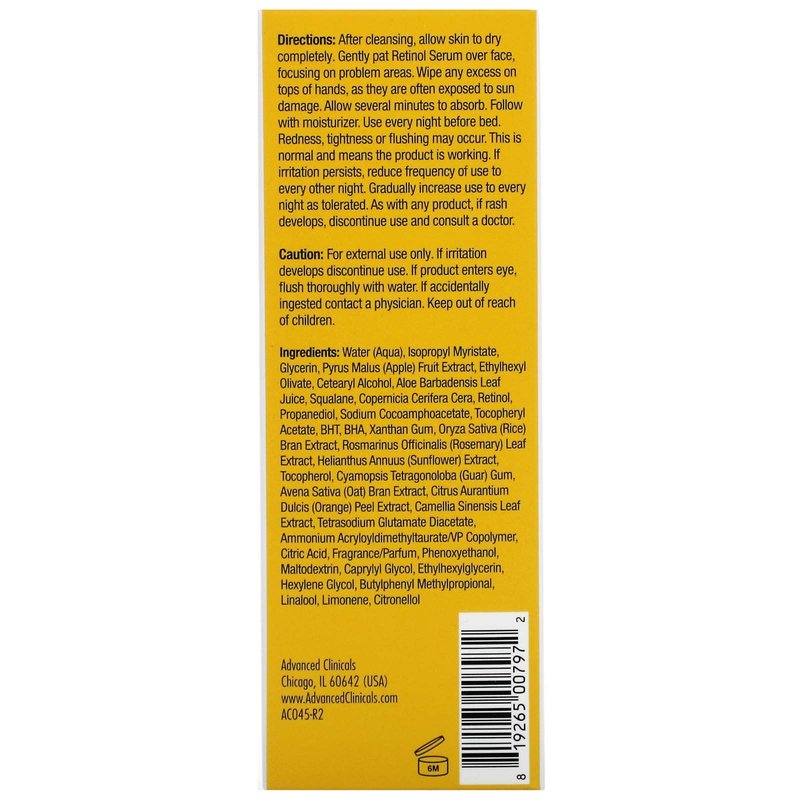 - RELAX, FIRM, & RESTORE – Dermatologist-Tested, Clinically-Tested, & Allergy-Tested Formula. Manufactured in our FDA-Regulated & Inspected Laboratory in Chicago, USA. If for any reason you decide this Advanced Clinicals Retinol Serum isn't a fit for your skin, we're here for you. Each purposefully balanced medley of key antioxidants, super-nutrients, & nourishing botanical actives enhance efficacy & delivers long lasting skin-friendly benefits, without harmful additives or fragrances.