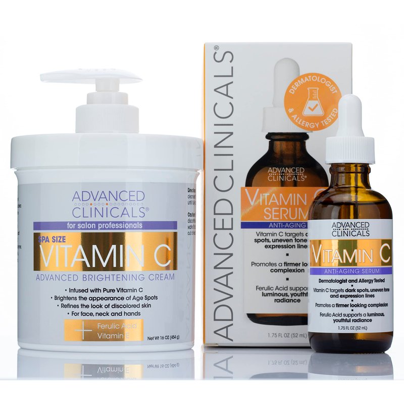 - RADIANT SKIN – This Advanced Clinicals Vitamin C Body Cream helps refine the look of aging skin and uneven skin tone. Vitamin C helps promote an even skin tone, while also helping stimulate collection production to help improve skin elasticity + firmness. Advanced Brightening Vitamin C Body Cream & Face Lotion helps refine the look of discolored skin, age spots, freckles, sun damage from sunspots, rough skin texture, hyperpigmentation, & acne-scars.