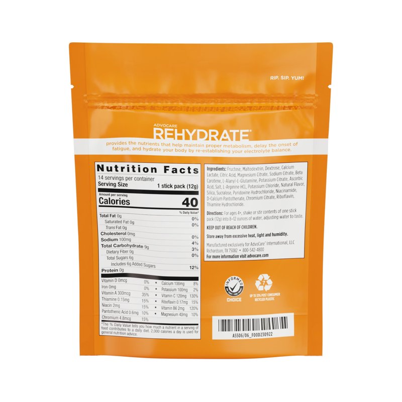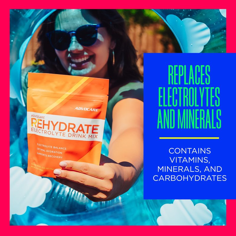 AdvoCare Rehydrate provides the nutrients to help maintain proper metabolism, delay the onset of fatigue, and hydrate your body by re-establishing your electrolyte balance. Rehydrate has a 1:1 ratio of sodium and potassium, two of the most vital electrolytes lost when we sweat. Overall, Rehydrate includes antioxidants (vitamins A and C), carbohydrates, electrolytes, and other nutrients that effectively support optimal hydration and recovery.