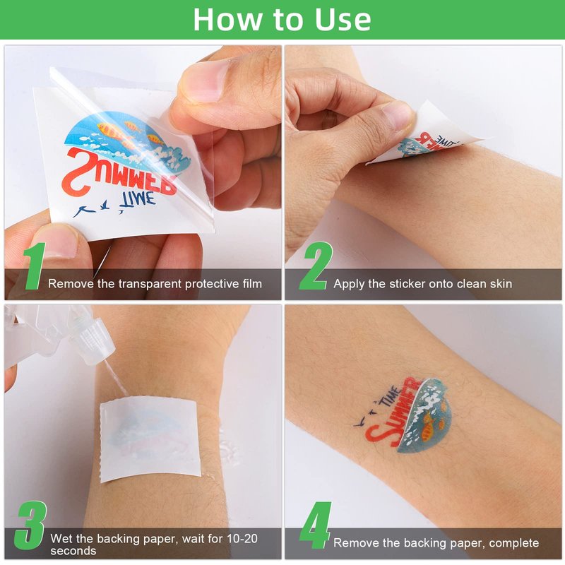 - Easy to use: with the cutting line design, the tropical tattoos are easy to stick and remove; just tear off the outer protective film, then stick the sticker onto clean skin and use wet cloth to wet the sticker; when the sticker becomes dry, the pattern will be printed on the skin, then you can tear off the sticker