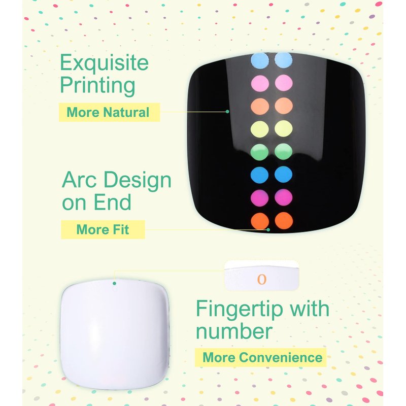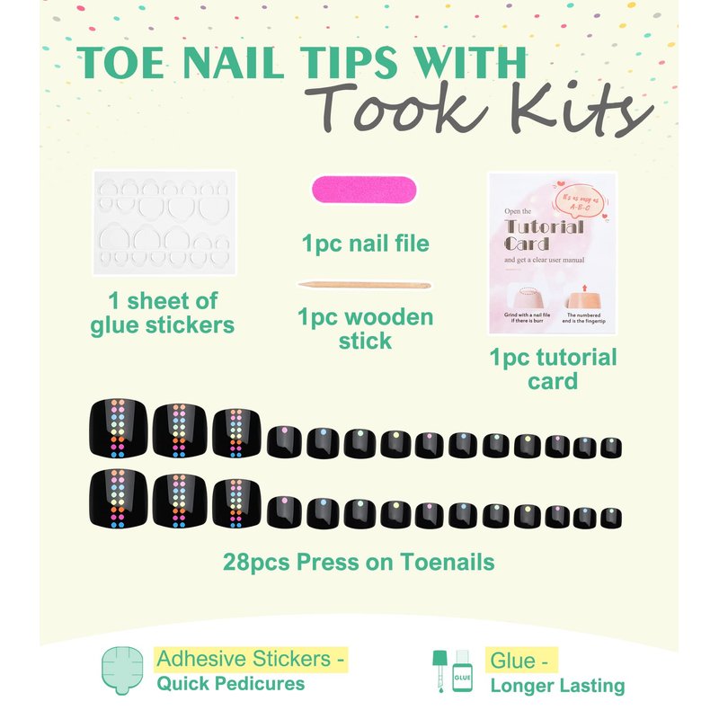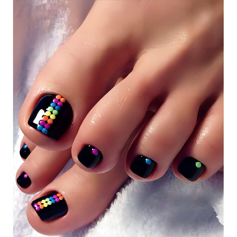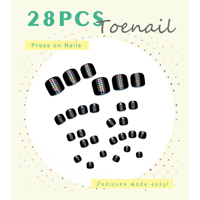 - Black mixed dots press-on toenails are a simple and versatile pattern that is easy to create instant and long-lasting glamour for your feet. Giving a professional retro or modern-looking finish in minutes