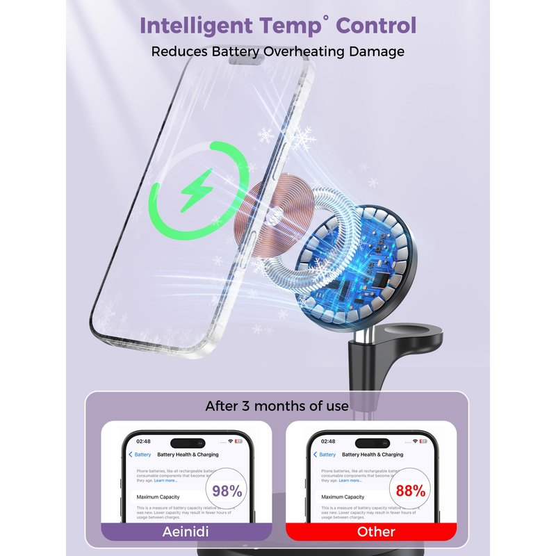 - 3 In 1 Mag-Safe Charger Stand - Aeinidi 3 in 1 charging station for apple is a magsafe charger stand for efficient wireless charging of iPhones, Apple Watches and AirPods. With this innovative charging stand, you no longer have to search for multiple chargers or deal with a cluttered desktop. Say goodbye to clutter and hello to convenience!