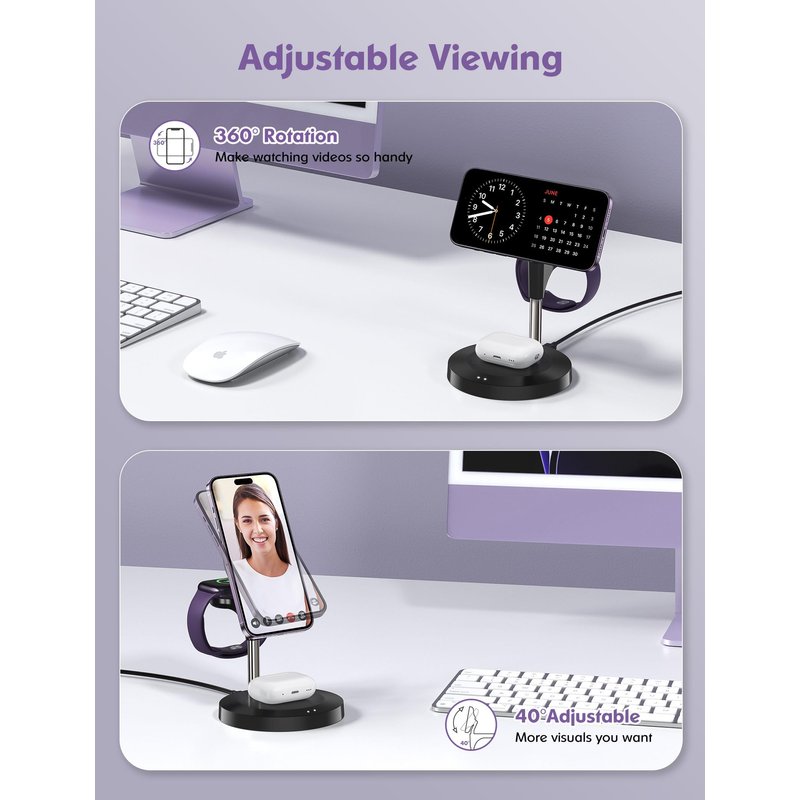 - Adjustable Viewing Angle - Allows the iphone magsafe charger to swing up to 40° up and down and the iphone to be placed horizontally or vertically, giving you the flexibility to position your iphone for the best visual experience. Aeinidi 3 in 1 charging station for apple is not only a Mag-Safe charger, but also a convenient iphone stand to keep your device within reach.