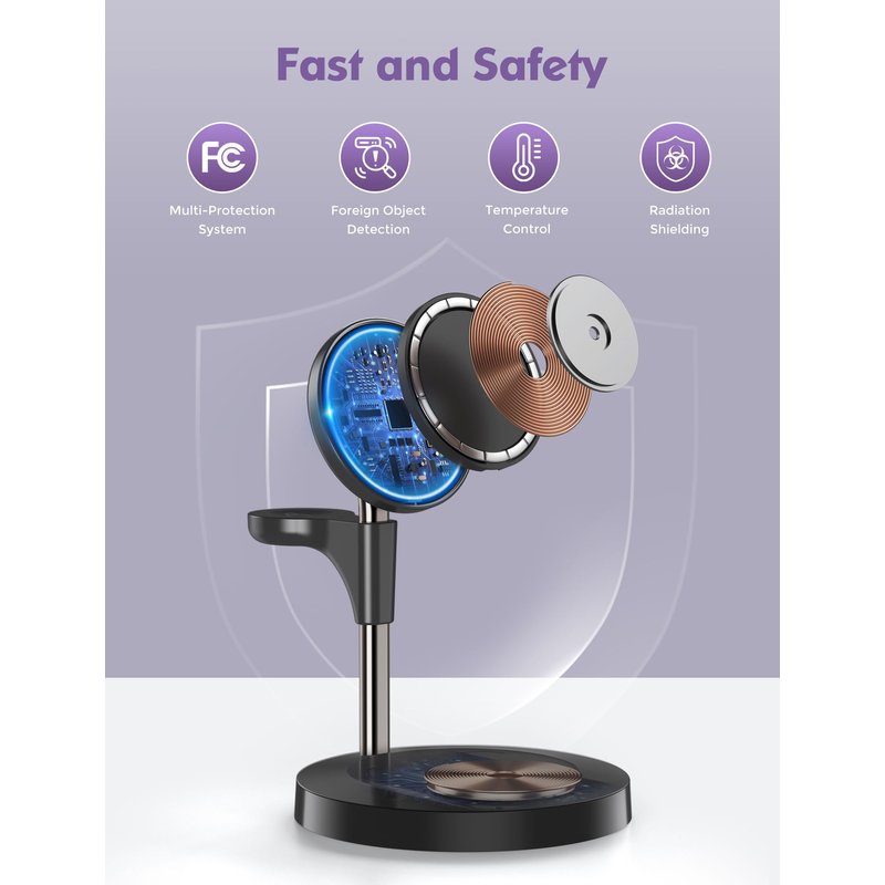 - Multiple Safety Protection - Passed rigorous testing and received FCC and CE certifications, Aeinidi Mag-Safe charger stand upgraded over-current, over-voltage and over-heat protection and foreign object detection ( the indicator light will blink in case of an abnormal state). Just charge your devices with confidence with this high quality and safe 3 in 1 charging station for apple!