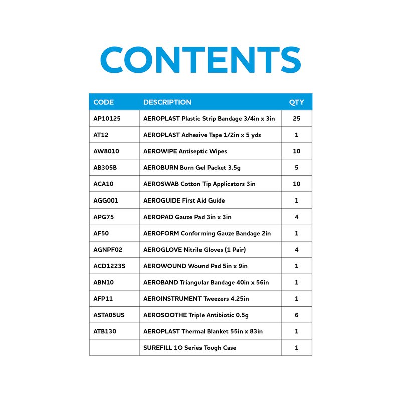 The Aero Healthcare Surefill 10 Weatherproof First Aid Kit contains everything you need to treat injuries or burns inside a durable weatherproof case. The plastic case is the perfect size for easy storage inside vehicles or the home and provides protection against water, dust and demanding conditions to keep first aid items sterile. The 72-pc. kit includes Aeroplast bandages with Supabond adhesive for unrivaled adhesion, adhesive tape, antiseptic wipes, burn gel packets, cotton tip applicators, gauze bandages and pads, nitrile gloves, a wound pad, a triangular bandage, triple antibiotics, a thermal blanket, and weatherproof case.