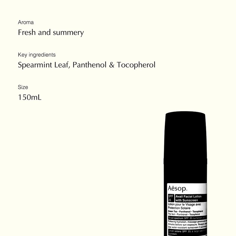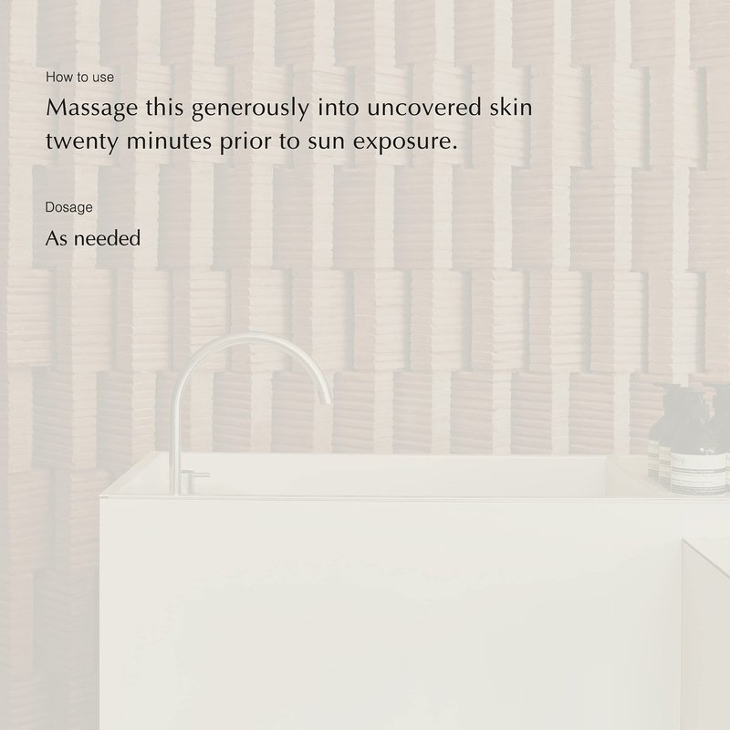 Aesop's Perfect Avail Body Lotion SPF 50 is beautifully fragrant and contains skin protecting and hydrating botanical extracts that protects your skin from sun rays. Like all Aesop’s products, its formulation is created with meticulous attention to detail, and with efficacy and sensory pleasure in mind. The invigorating botanical ingredients: Sodium Ascorbyl Phosphate, Frankincense & Tocopherol help nourish your skin. It is suitable for most skin types, particularly normal and dry to very dry skin.
