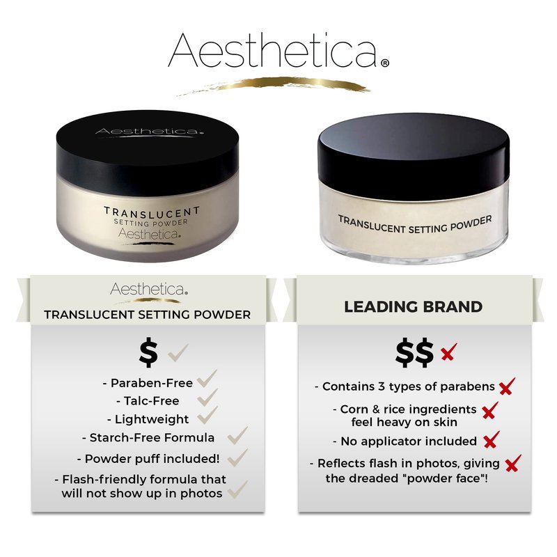 - The Aesthetica Translucent Setting Powder helps expertly set freshly applied makeup so it adheres to skin for hours. The lightweight formula soaks up excess oil while softening fine lines and hiding pores.