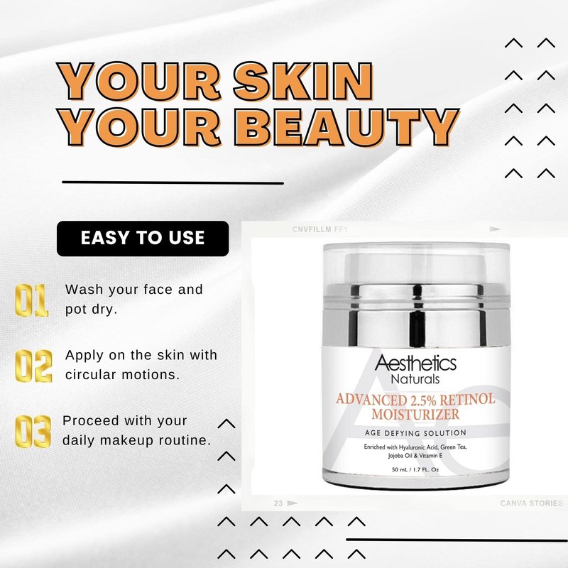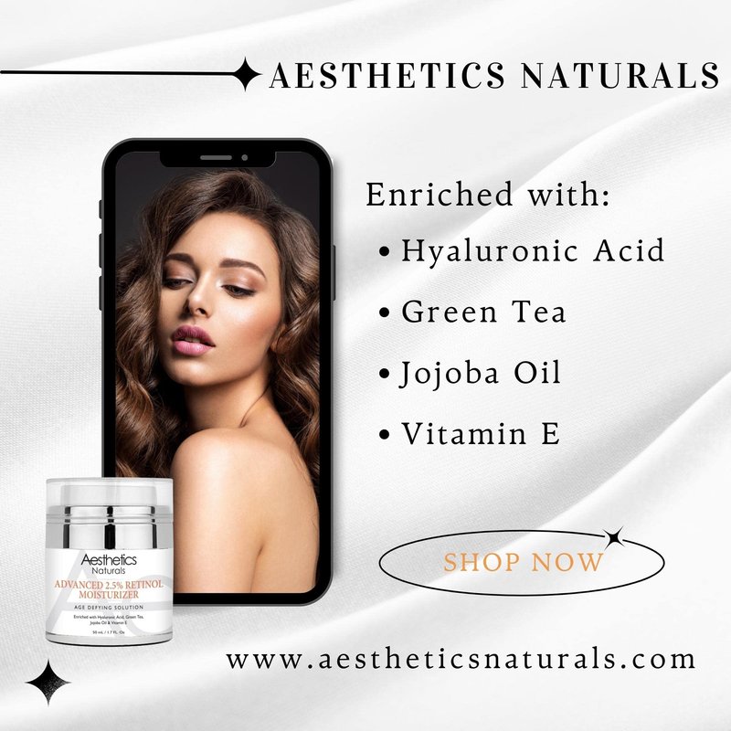 Introduction Our Advanced Retinol Cream is an Anti-Aging, Hydrating, and Nourishment cream this is a proven ingredient known for its ability to reduce fine lines. Anti-aging cream reduces the appearance of wrinkles and crow’s feet, and evens and brightens skin tone, helping you achieve a youthful complexion. This isn't just your average anti-aging cream. It's a moisture-boosting miracle. Infused with skin-loving ingredients like hyaluronic acid, organic jojoba oil, and shea butter, Aesthetics Naturals Retinol Cream drenches your skin in hydration, leaving it soft, supple, and radiantly smooth. SOME AMAZING FEATURES IN OUR PRODUCT •Retinol Concentration •Hydration Powerhouse •Antioxidant Protection •Day and Night Usage •Gentle and Organic •Reduces Signs of Aging •Moisturizes and Smooths Convenient and Easy to Use Always begin your skincare routine with a clean face. Use a gentle cleanser to remove makeup, dirt, and impurities. Pat your skin dry with a clean towel. If you're new to retinol or have sensitive skin, perform a patch test. Less is more with retinol, as it can be potent and may cause irritation if overused. Gently dot the cream onto your forehead, cheeks, chin, and neck. Avoid the eye area and lips, as these areas can be more sensitive. Massage in Using Upward and Wait for Absorption. Be Patient Results from retinol can take several weeks to become noticeable. It's essential to be patient and consistent with your routine.