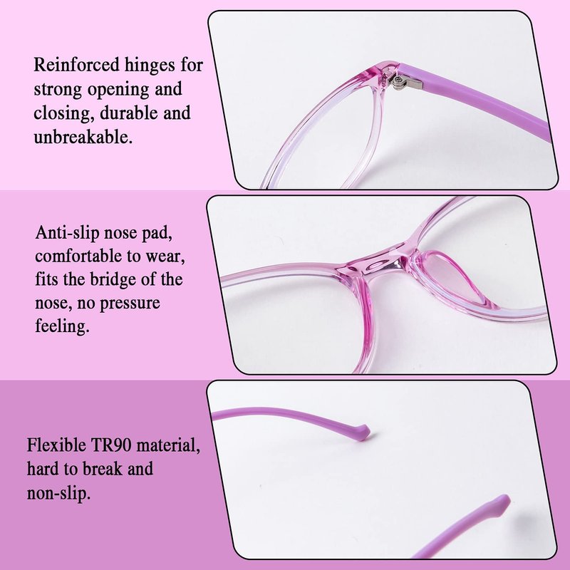 - 【Cute & Stylish & Well-made】-- Made of high-quality TR90 eyeglass frame material. The TR90 frame surface is more delicate and the color is more bright. The temples of built-in memory metal are not be deformed by any bending, not easy to break and fall off, comfortable to wear, which can effectively reduce eyestrain and protect well your kids' eyes from influence.