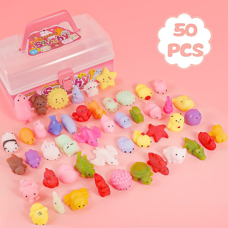 - Gorgeous Packaging and Practical Storage Box: Aeyohni Squishy 50 pcs (No duplicates) are organized in a very functional organizer box and packed into a beautiful gift box, perfect for gift giving and easy to carry to classrooms, parties, and also to exercise children in organizing their own toys.