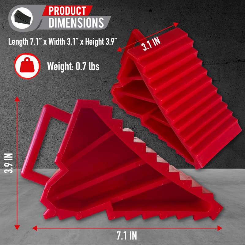 - SMALL WHEEL CHOCKS: At 7.1 x 3.1 x 3.9 in and 0.7lbs these wheel chocks work best for vehicles, ATVS, trailers and RVs that weigh up to G.V.W 1T.