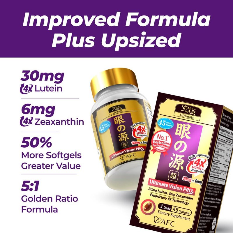 AFC Japan Ultimate Vision PRO – Improved, Up-Sized Formula - Support Vitamins for Eye Health with Lutein, Zeaxanthin 4X, Bilberry, Nutrients for Blurry Dry Eyes, Macular Health & Focus, 45 Softgels