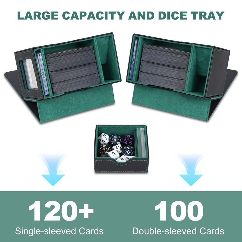 - 【Ample Storage Space】With an internal size of 4x3.15x2.8 inches, this deck box comfortably fits 100 double-sleeved cards or over 120 single-sleeved cards. The large dice tray can accommodate up to 15 D20 multi-sided dice, making it an ideal choice forthose who need a reliable storage solution for their collection of deck boxes and card cases.